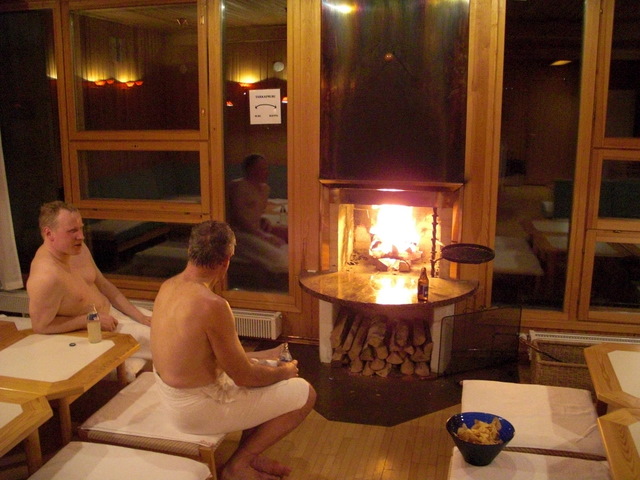 | Nach dem Saunagang bei Bier und Chips am offenen Kamin |