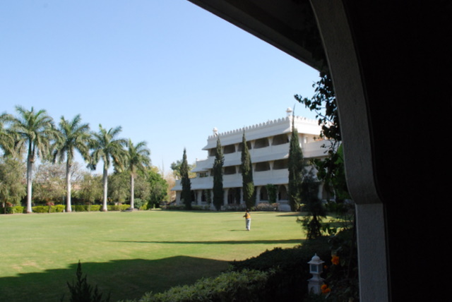 Endlich mal ein Wochenendausflug. Rechts sieht man vom Hotelzimmer aus in den Garten des Taj-Hotels in Aurangabad. |